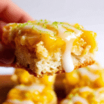 Sweet mango bars with a coconut-oat base, topped with a tangy lime glaze — a tropical, fruity dessert perfect for any occasion.